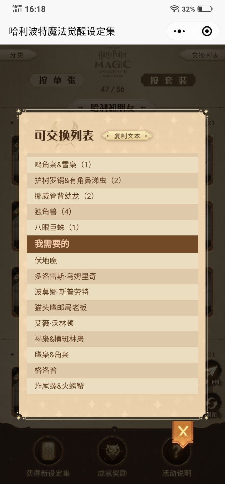 哈利波特魔法觉醒设定集 集换 有无?我拥有的霍格莫德村(1);格兰芬多公共休息室(1);黑魔法防御课教室(1);魁地奇球场(1)我需要的霍格莫德邮局;佐科笑话店;帕笛芙夫人茶馆;尖叫棚屋;猪头酒吧;赫奇帕奇公共休息室;拉文克劳公共休息室;古灵阁;猫头鹰邮局;摩金夫人长袍专卖店;魔咒课教室;变形课教室;魔药课教室;保护神奇动物课堂
