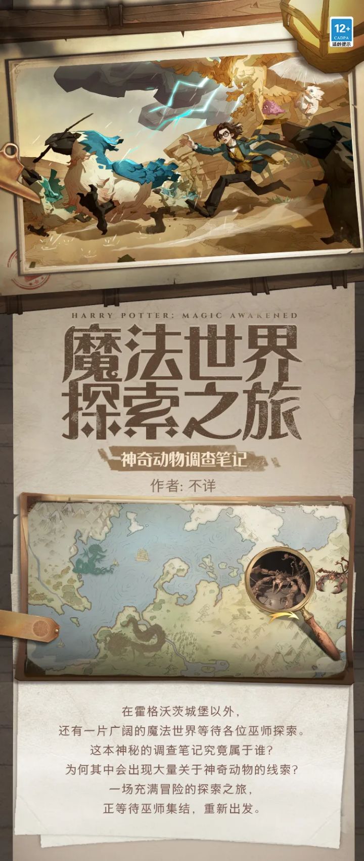 离开校园向更广阔的世界进发各位小巫师们欢迎参加霍格沃茨建校以来首次开课的「神奇动物实践课」请收好以下课程指南准时在海格小屋前集合此外,小雪鸮还发现了一张作者不详的调查手札希望上面的线索将会对各位巫师有所帮助配图为研发过程中画面,所展示内容仅供参考最终效果以正式服实装内容为准「神奇动物实践课」教学大纲:🏜第一站目的地:沙漠区域✧任课教师:卢娜·洛夫古德✧调研任务:✔