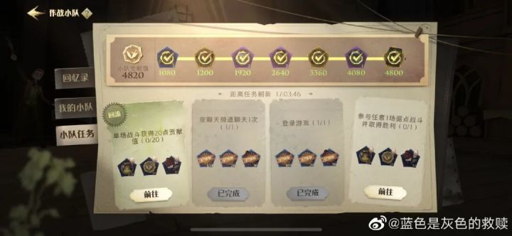 体验服最终决战将于今天晚上七点开启,不出意外明天我会写一篇文章更新最终决战的奖励与内容。感兴趣的小巫师别忘了关注一下我,以便第一时间收到更新内容。同时战斗小队第二阶段开启,如果队伍中有回流玩家可以直接抵消1200贡献值。正常玩家的战斗小队应该和下图一样,需要达到六千贡献值才能拿到金卡:而有回流玩家的战斗小队金卡贡献值为4800:图片来自微博攻略大佬 @小熊芝士糕糕 评论区,来源小巫师ID: