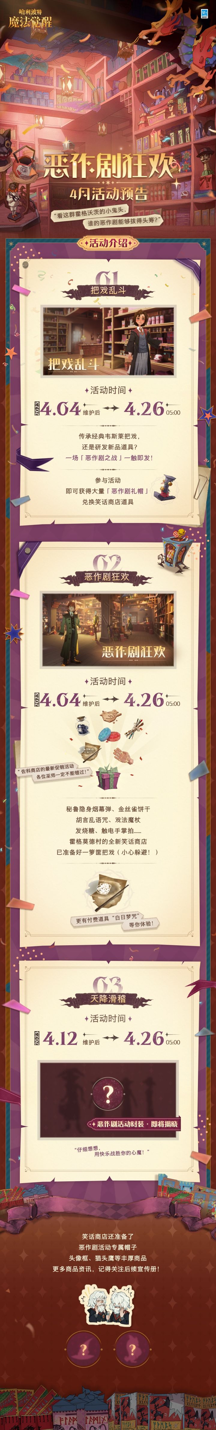 一场专属于巫师的恶作剧狂欢即将开启做好准备迎接来自四面八方的“惊喜”与欢乐在霍格莫德村度过一个充满欢声笑语的春天吧更多活动预告一起来看看这份“恶作剧指南”↓↓↓✦皮皮鬼的新线索✦“看这群霍格沃茨的小鬼头,谁的恶作剧能够拔得头筹?”,伴随着缤纷的礼炮与轰隆隆的炸弹,皮皮鬼向小雪鸮传递了本月活动的新线索(4月1日即将到来,注意明辨真假)!✧新闻一:韦斯莱兄弟突降佐科笑话商店,传承经