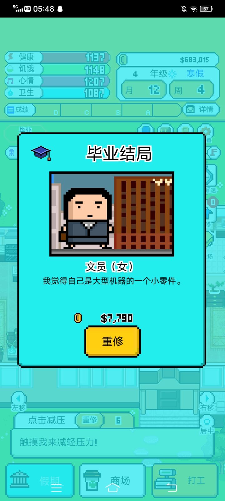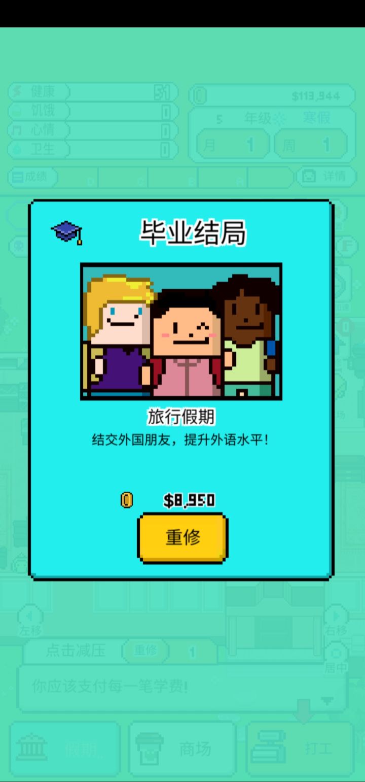 😅刚开始玩是感觉很新鲜的,以为要精打细算生活费过大学,想不到的是我只要爆点人物就能轻松赚到钱,根本不需要打工什么的,然后就变成了一款点到手累就能随便买买买的游戏。😅当我想看广告偷懒的时候,我发现广告根本不给我看,一定要我继续点点点。😅感觉毕业的结局不是很满意,毕业后又要重新来一遍,但是已经没有耐心再打一个结局了。