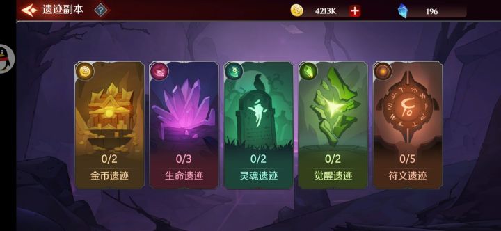遗迹副本是资源的主要产出玩法。首先遗迹副本分为五种,每天每种副本可以挑战2次,可以花费魔石购买挑战次数。提高等级还可以解锁新的副本层数,越高层的副本战斗难度越高,可以获得的资源也越多。金币遗迹:可以获得大量金币。生命遗迹:可以获得大量生命石,生命石用于魔灵升级。灵魂遗迹:可以获得大量灵魂石,灵魂石用于魔灵突破。觉醒遗迹:可以获得大量觉醒石,觉醒石用于魔灵觉醒。符文遗迹:可以获得大最随机
