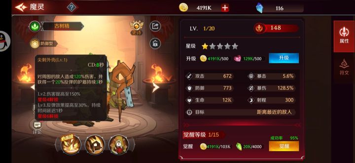 【加德尔最强橙色肉盾神卡】今天来说说最强橙肉盾神卡【古树精】,在红卡肉盾一堆的游戏里,古树精作为一个橙卡,可能好多人都都会换掉,但是根据我玩了三次测试的经验来说,古树精作为一个橙卡,入手难度一般,升星也比红卡容易的多,最主要很实用,比很多红卡都实用,那么我就来给大家分析一下古树精。古树精的大招是对周围敌方造成130%伤害,还能反弹敌人20%伤害,算是中规中矩吧,那为什么还说他是神卡呢,因为他的