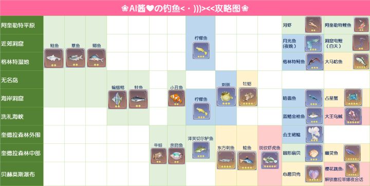 Hi米娜,这里是努力码字的AI酱●▽●AI酱今天终于打出了乌金木做了冒险者鱼竿!然后钓了一整天的鱼做了个钓鱼攻略+图鉴(还好我之前存的鱼饵很多_(:з」∠)_)虽然是公测的最后一天了,但是还是希望以后的测试还能够用得上哈哈!!我有保存Excel的~这是第一次做攻略呢!!!超开心的!!PS:谢谢群友 @半夢伴醒 补充的占星蟹图❤