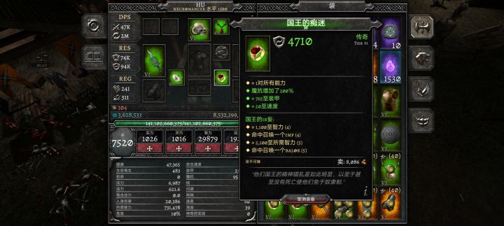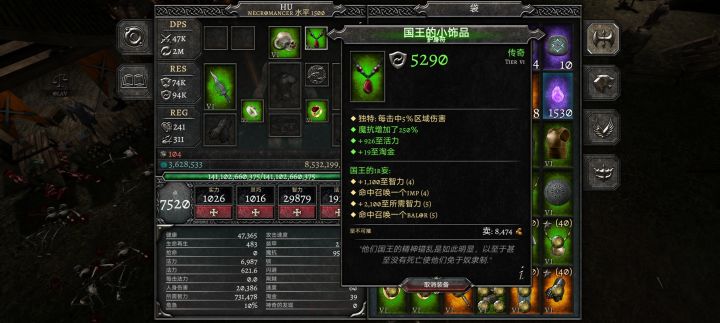 国王的IR妄套装,通用召唤5件套装+智力,命中召唤怪物IMP、BALOR 自编套装的名字的起源:国王对于小饰品的痴迷,贵族苦劝国王放弃小饰品,国王很沮丧,因为没人理解我,从此国王的疯狂永无止境导致灭国。