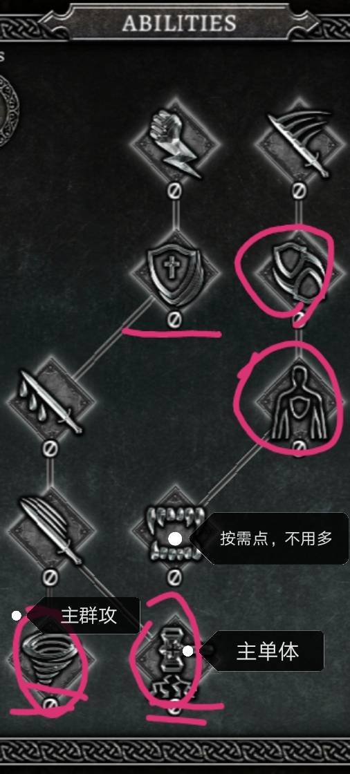 只写基础,后期装备,副职业,变化较多。鉴于大家都是非酋,就不写那些从开荒至少10天才能达到要求的装备build了。三张图,一个职业一个,单横线的是位移技能,给一点足以,别为了减蓝耗点到高等级,前期点给输出和防御技能,后期不缺蓝圈起来的技能点满。双横线主力输出技能。其余过路一点属性点,所有职业,100级前,力,敏,智够穿装备,其余全体力100级后根据装备判断,补短板。弓手除穿装备外,不加敏捷仅角