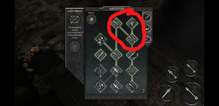 技能搭配前期的话用我圈出的这三个技能就可以比较轻松的过关了,不用去升太多技能等级,差不多2-3级就可以。其他没什么好说的。等到大概17-18级你就可以解锁第三列的技能,第三列的第一个技能可以增加物理和魔法伤害。第二个技能剧毒箭,必点!!!可以说你点了它游戏就变成了割草游戏无脑莽,射手变战士,站撸小怪和boss。技能效果是攻击时给目标持续的伤害。第三个技能是增加攻速,被动技能点亮即可。我的后期技