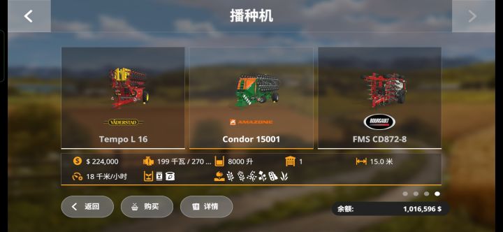 AMAZONE Condor 15001播种机,犁地施肥播种三合一,作业宽度15米,游戏里最好最高效的播种机了。但是细节跟现实还是有些差距,两侧的小轮子都做成八边形了😓,还有就是没有连接管线。