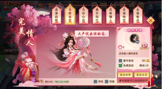 梦青云,从相遇到相知,从红颜到伴侣,与那个ta一眼万年情定三生!仙界有绚丽多彩的完美情人活动,为各位上仙开启浪漫爱情之旅~ 【浪漫启程】 达到213级开启仙缘系统,即可领取浪漫启程奖励 【寻爱宣言】 达到160级可在“寻爱宣言”页面发表宣言,寻觅仙侣,快来大声说出你的爱,邂逅有缘人吧!单身的上仙在活动期间每天有一次免费发布宣言的机会,发布宣言的有效期为12小时,且每人同一时刻仅能显示一