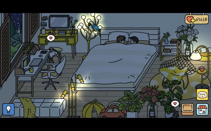 发现了一个bug 就是没当我进入给猫咪投食那儿,我的爱心会清零,等我再回到客厅场景的时候,原有的爱心都归于100