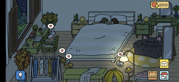 这是我们第一天一起睡觉觉的照片旁边的猫猫的爱心都像是祝福这个游戏特别让人感动的是可以选同性室友(?)但是时间线有点混乱的感觉,伴侣总夜不归宿(?)留我一人独守空房
