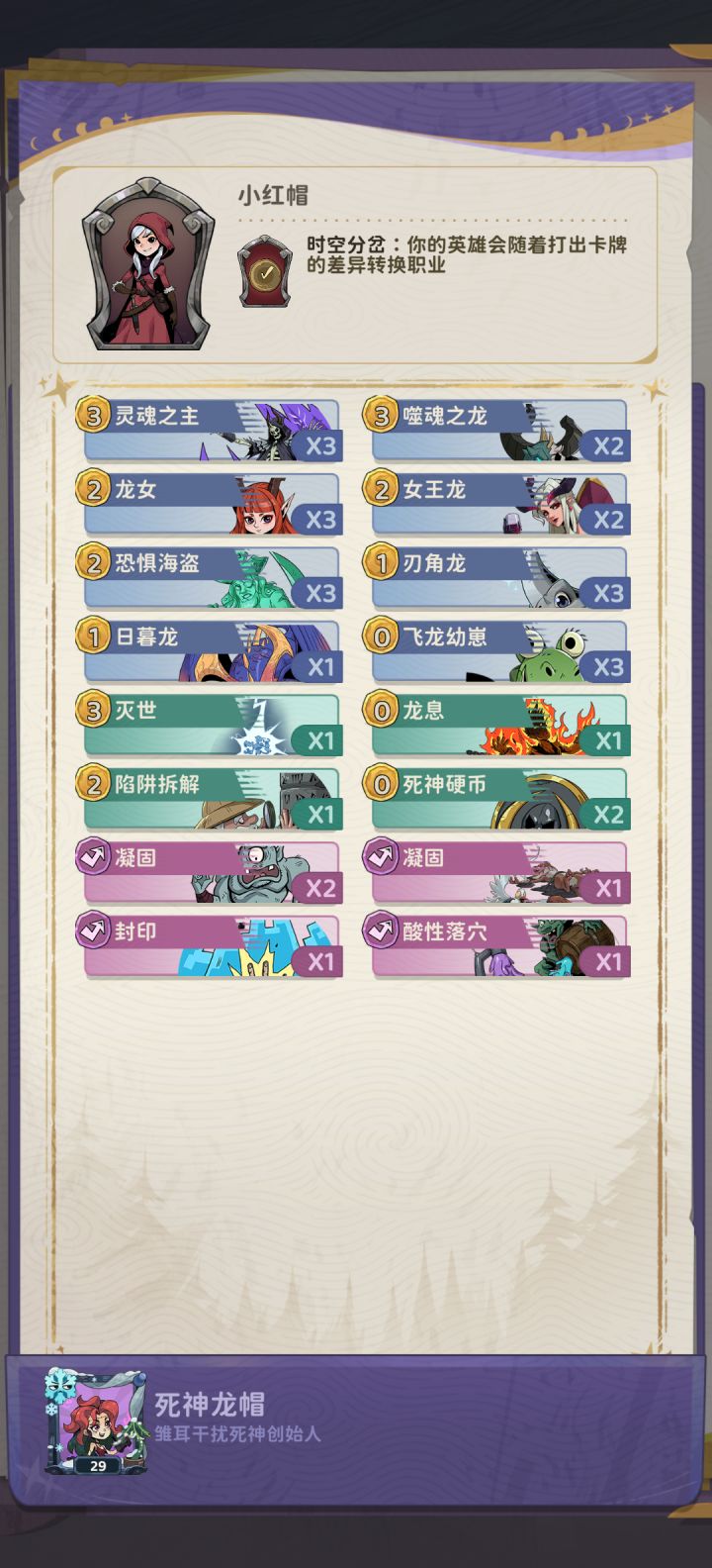 新科研卡组,灵魂之主和硬币的组件非常丝滑,解决龙帽废金币和叠伤不够问题,海盗用来破节奏➕叠鬼整体和龙帽异常适配,比我之前研发的干扰死神玩起来更爽且利维坦存在斩杀能力更强。经测试可以达到t1卡组水准。
