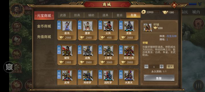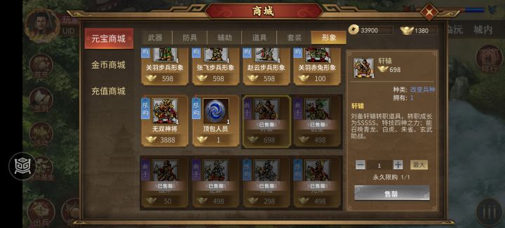 在低周目内购属性不高,或仅玩简单-噩梦的,糜竺是性价比最高的肉盾,元宝598最便宜的伪神“财神”。两大神技:1)挥金追义-金钱防御:只要金钱多,就不会死,常常在乱军中充当“肉盾”吸引火力;2)乾坤一掷:无限法术追击,清场一片,练智力果神器。受到普通玩家喜爱,也有不少真爱“糜粉”。原万人斩技“装备等级+6级”,还是挺有趣、挺新奇的技能,吸引糜粉们去刷。这次更新,直接削了,更改为“每回合武器经验+5
