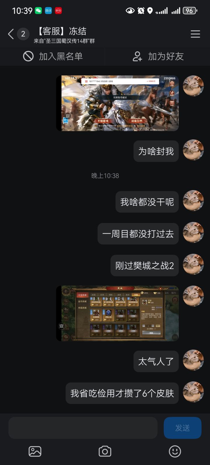 如题,普通刚入坑小白啥也没干被封,最强的赵云的装备还是签到给的,无处申诉,账号安全无法保证,各位大佬们充钱需谨慎!!不知道什么垃圾检测,真是气死了,累死累活快二十天,就想好好过剧情,把彩蛋剧情弄完,结果给我封了让我重头再来?之前签到买的东西怎么办,虽然充的不多,但是还是内购了吧,累死累活打了这么久,买了6个皮肤,结果来这出?垃圾检测让普通玩家买单吗?!!真是气死气死了。要不是为了之前三国志曹操