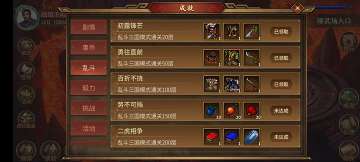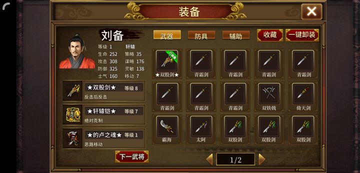 令人无语的设定,对比于三国志吕布传,装备专属特性只能作用于个人,这个特别无语。穿了皮后就不能带自己的装备,无语。练果很无聊,并且只能用店装练,人头只能一个一个打。万人很好,打到一万人相当于杀了十万人。真的吐了