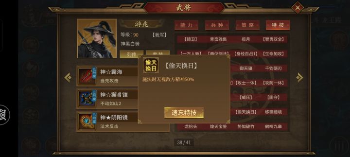 如图,游兆吃了【避实就虚】和【偷天换日】两个特技,这两个特技的触发顺序是怎样的?游兆的两个全屏特技主要看攻击、防御和士气,其中轩辕剑气:0.6(攻-防)+0.4(士-士),极寒风暴:0.6(攻-防)+0.4(防-攻)。问题来了,游兆的【偷天换日】会不会有作用?会不会先“无视对方精神50%”,然后再“以属性最低的一项作为防御”(即以降低50%后的精神作为防御)?还是说,优先生效【避实就虚】,选择了一