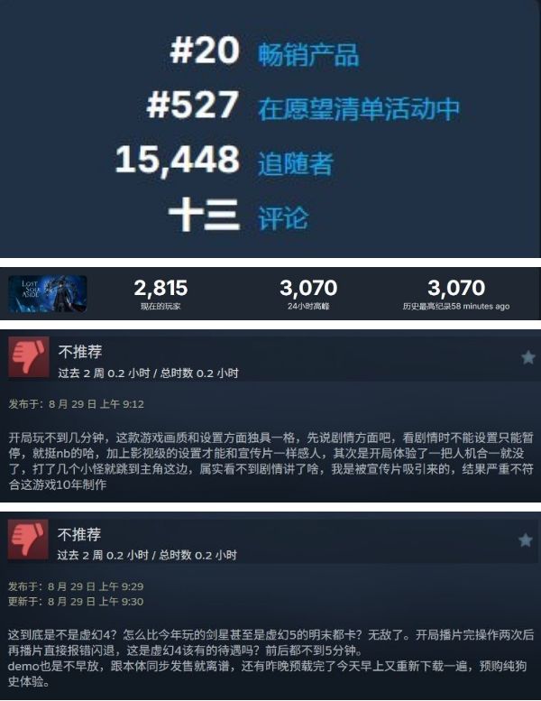 国产ARPG《失落之魂》今日正式发售,不过评价不高,大多原因还是和游戏本身有关,包括手柄不能改键与首发的优化灾难。首发Steam评价“多半差评”,在48篇评论中仅有33%的好评率。此外,根据SteamDB的数据,本作位于Steam畅销产品第20位,首发人数峰值达3070。抛开场外元素,差评的主要内容在于优化问题,大多玩家反映开局一分钟便闪退,开场动画仅有30帧,无法绑定PSN账号等。官方曾发文