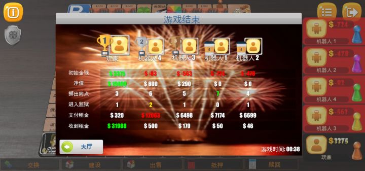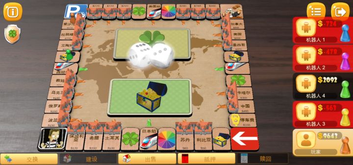 和机器人玩的时候初始金越高越好,3000基本足够。要尽快集齐同色地,同时要买其他机器人手里的地,防止机器人集齐。同色地前期建设当属爱沙尼亚,保加利亚这两块地所属地块性价比高,优先集齐其中任意一块,留部分防意外的钱外全部盖房,这样才能在前期迅速积累资金。买地要尽早,当同色三块地都有主人时购买价格会提高,越早买价格越低。前期有了同色地,并尽量其他色都有一块地在自己手里,这把就赢了,剩下的就是时间和机会问题了。按这个办法只要开局运气不要差到离谱,基本都能赢。