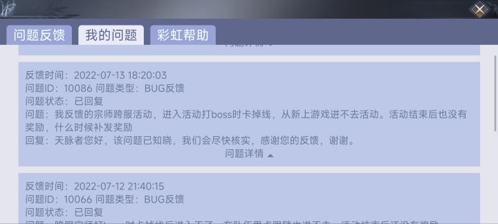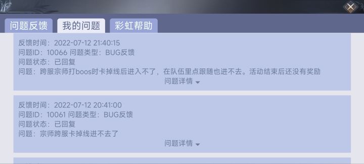 玩这游戏有段时间了,个种问题,以前的游戏更新后活动不更新做不了任务什么的就不说了。前两天的跨服宗师打boss时卡掉线了。从新上游戏就进不去宗师副本了,最后导致队友拿了个第四名。我反馈BUG给客服,然后让给我补偿。结果就给了个20名以后的奖励。你游戏没做好用玩家来买单吗?