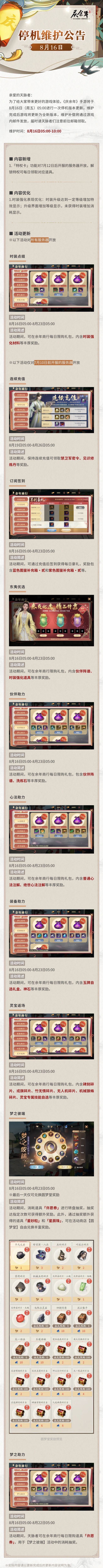 亲爱的天脉者:为了给大家带来更好的游戏体验,《庆余年》手游将于8月16日(周五)05:00进行一次停机版本更新,维护完成后游戏将更新为全新版本,维护补偿将通过游戏内邮件发放,届时请天脉者们注意前往邮箱领取。维护时间:8月16日05:00-10:00