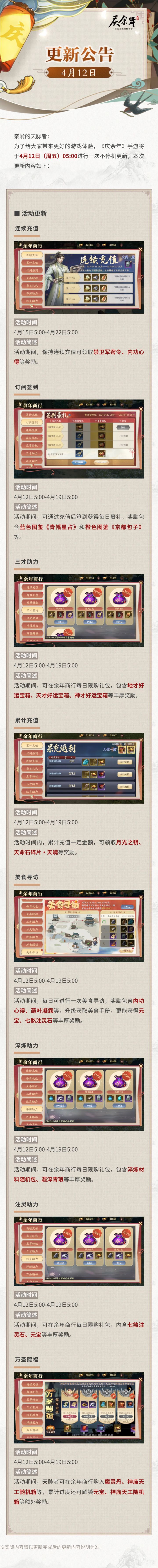 亲爱的天脉者:为了给大家带来更好的游戏体验,《庆余年》手游将于4月12日(周五)05:00进行一次不停机更新,本次更新内容如下: