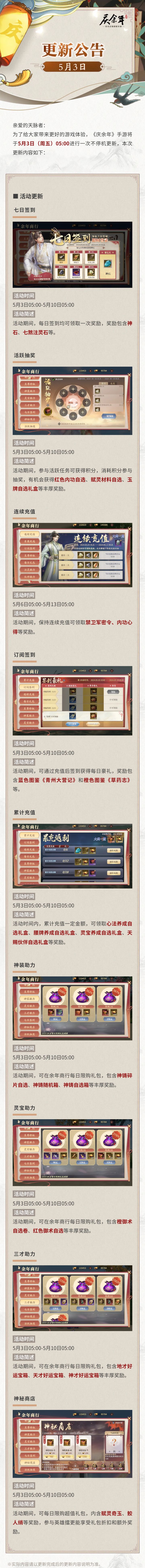 亲爱的天脉者:为了给大家带来更好的游戏体验,《庆余年》手游将于5月3日(周五)05:00进行一次不停机更新,本次更新内容如下: