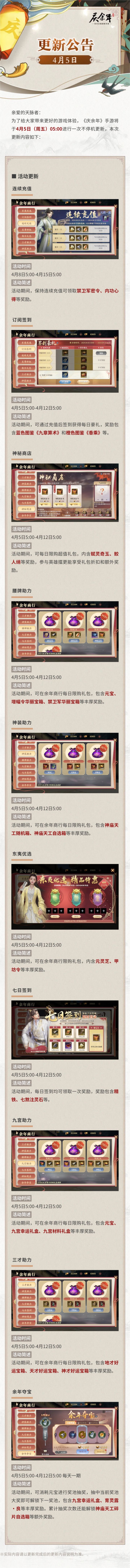 亲爱的天脉者:为了给大家带来更好的游戏体验,《庆余年》手游将于4月5日(周五)05:00进行一次不停机更新,本次更新内容如下: