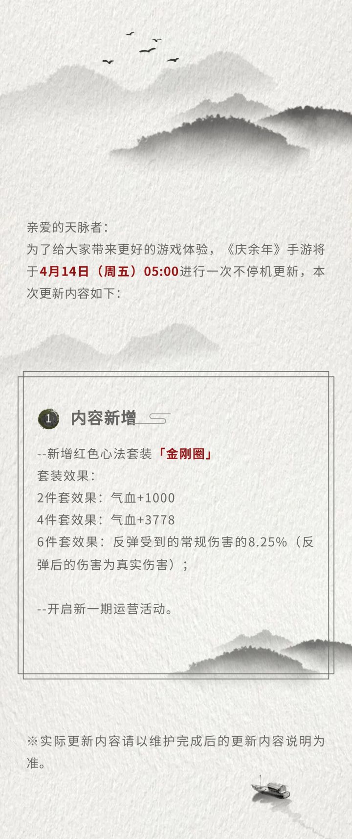 各位天脉者们好~为了给大家带来更好的游戏体验,《庆余年》手游将于4月21日(周五)05:00进行一次不停机更新,请大家安排好游戏时间哦!