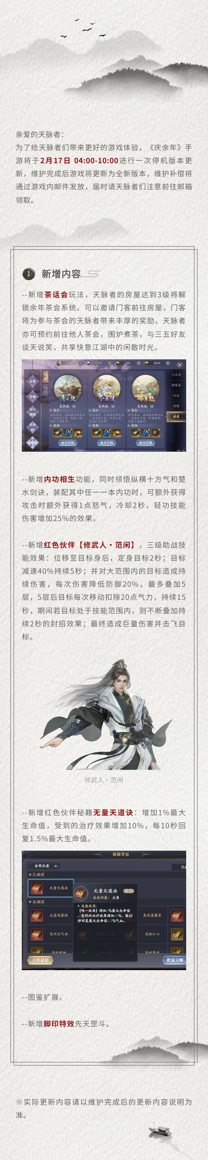 2月17日4:00-10:00将进行停机维护,各位天脉者记得安排好游戏时间哦!