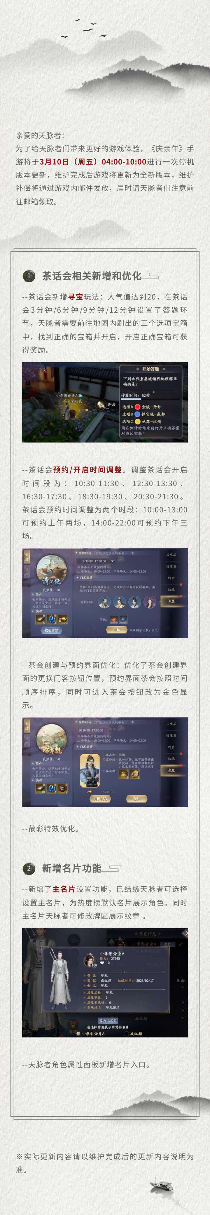 各位天脉者们好,3月10日(周五)04:00-10:00将进行一次停机版本更新,更新内容奉上