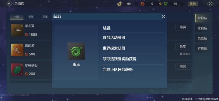 首先说一下兑换比例, 婴玉需要充值比例1:10 勾玉可以用婴玉兑换比例1:1 也可以在拍卖会交易物品赚取,也就是可以白嫖,最主要的是脂玉,这次官方太良心了,这次脂玉只能靠肝来获得,上测还能用勾玉兑换比例是1:1,但不重要了,因为微氪也能有游戏体验,前提你得肝,获得方式看图再来说说 月卡 30元 会立即得到300婴玉,30天内会获得60脂玉,30勾玉,算下来可以得到1800脂玉和900勾玉,勾玉商