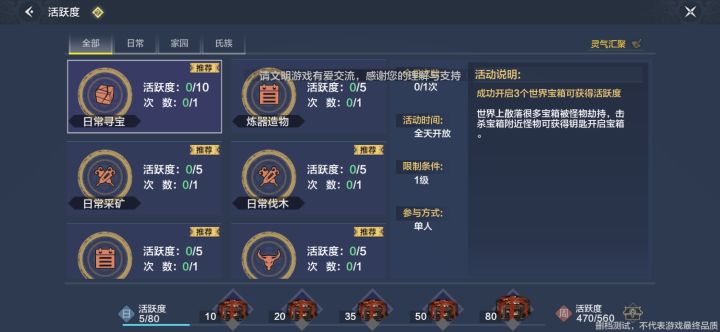 活跃度分为五个档次其中80活跃度档次开出金图纸,所以打满活跃度很重要。其中签到 5 活跃度 ,签到的时间与活跃度更新时间不一致,所以这里如果你凌晨签到的话,第二天的活跃度是没有的,只能等到下一个凌晨。其次就是炼器 5活跃度 任意炼器两次即可伐木与采矿还有捕捉灵兽 共计15活跃度而寻宝需要大家跑地图各个地方都要找找宝箱,三个宝箱10活跃度然后就是大头的活跃度 守护家园和火璃 守护家园在灵池