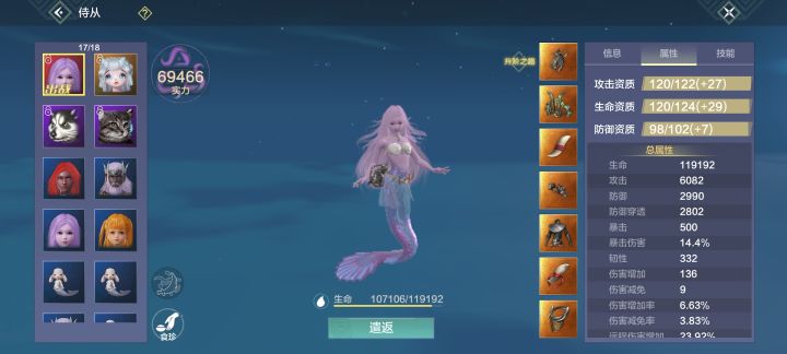 我看没人测评,特意开个贴。先上图,这是我的念奴儿的属性,昨晚知道人鱼技能改版,立马去找好基友收了个血蛋,直接进化。现在武器精通还是25%,27%的那一挡我还没顾上去化炁。2%应该差的不多,就凑活看吧。使用的是夹弩。然后更新前的秒伤,测试物:蚩尤图,百年,千年。更新前,蚩尤图秒伤在1万左右,现在是更新后时间有限就先只测了蚩尤图的伤害,秒伤提高了大概三千,技能是先一段远程伤害,一段近战