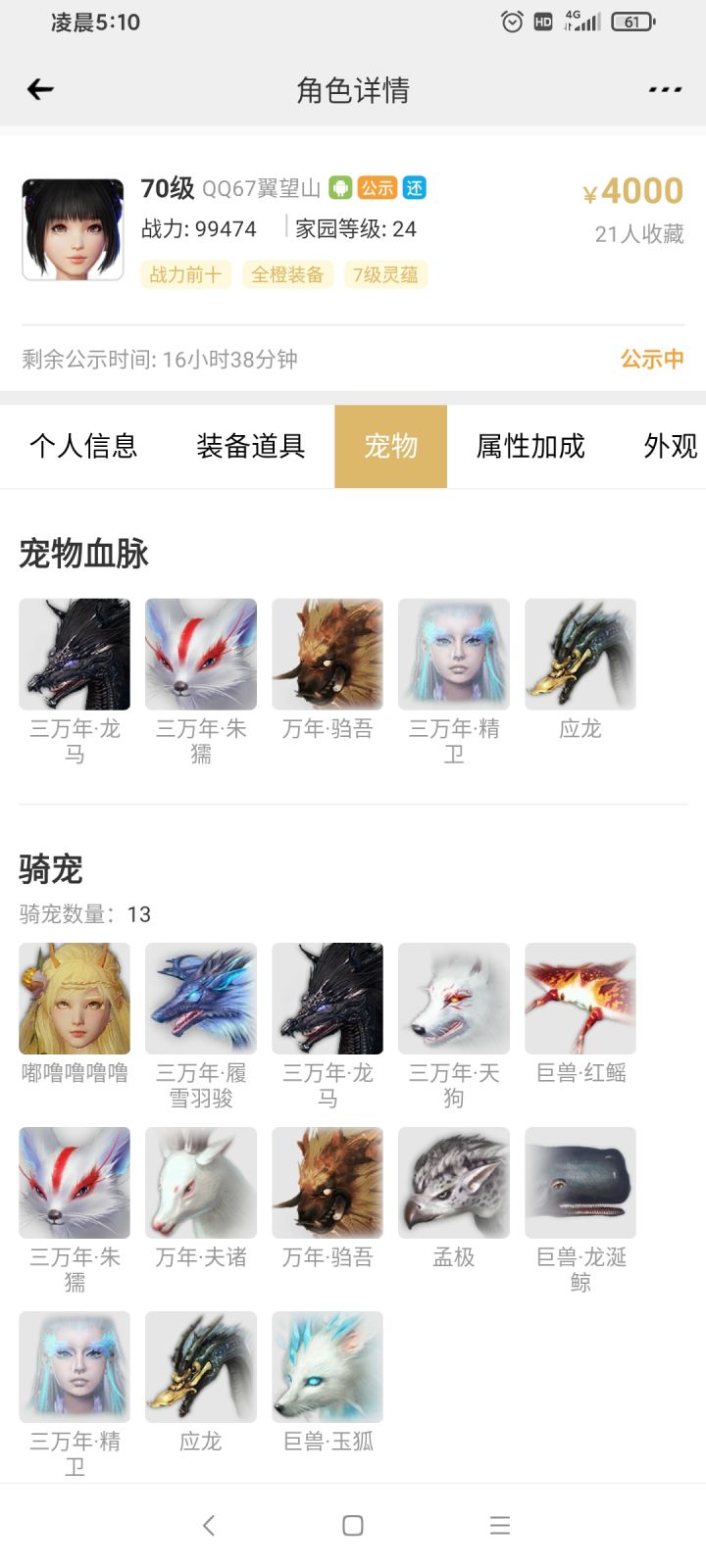 心悦出号了 67区榜1 132件时装 4套情绪 7件鸿蒙 7词鸿蒙双枪 神兽应龙 涂山君 带秘书105000战力 有兴趣的看看去啊