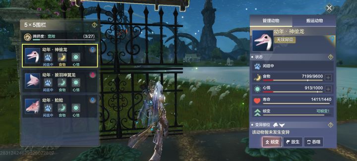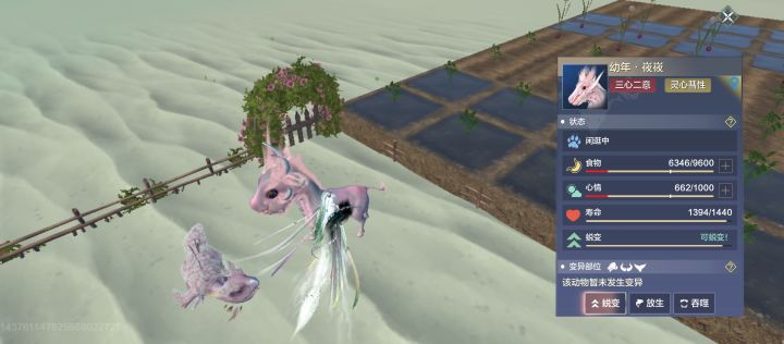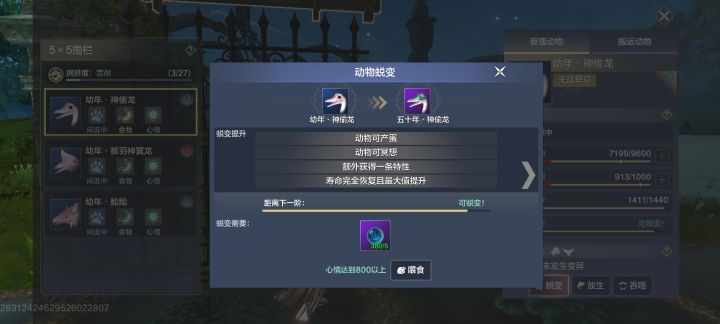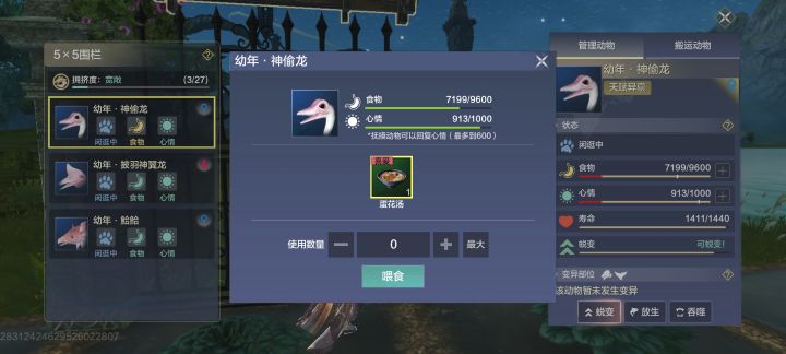 动物身上和兽栏的这个动物蜕变倒计时都归零了,心情也有900多,也提示可以蜕变了,一点蜕变按钮就变成了喂食,再点进去就到喂养食物的地方了