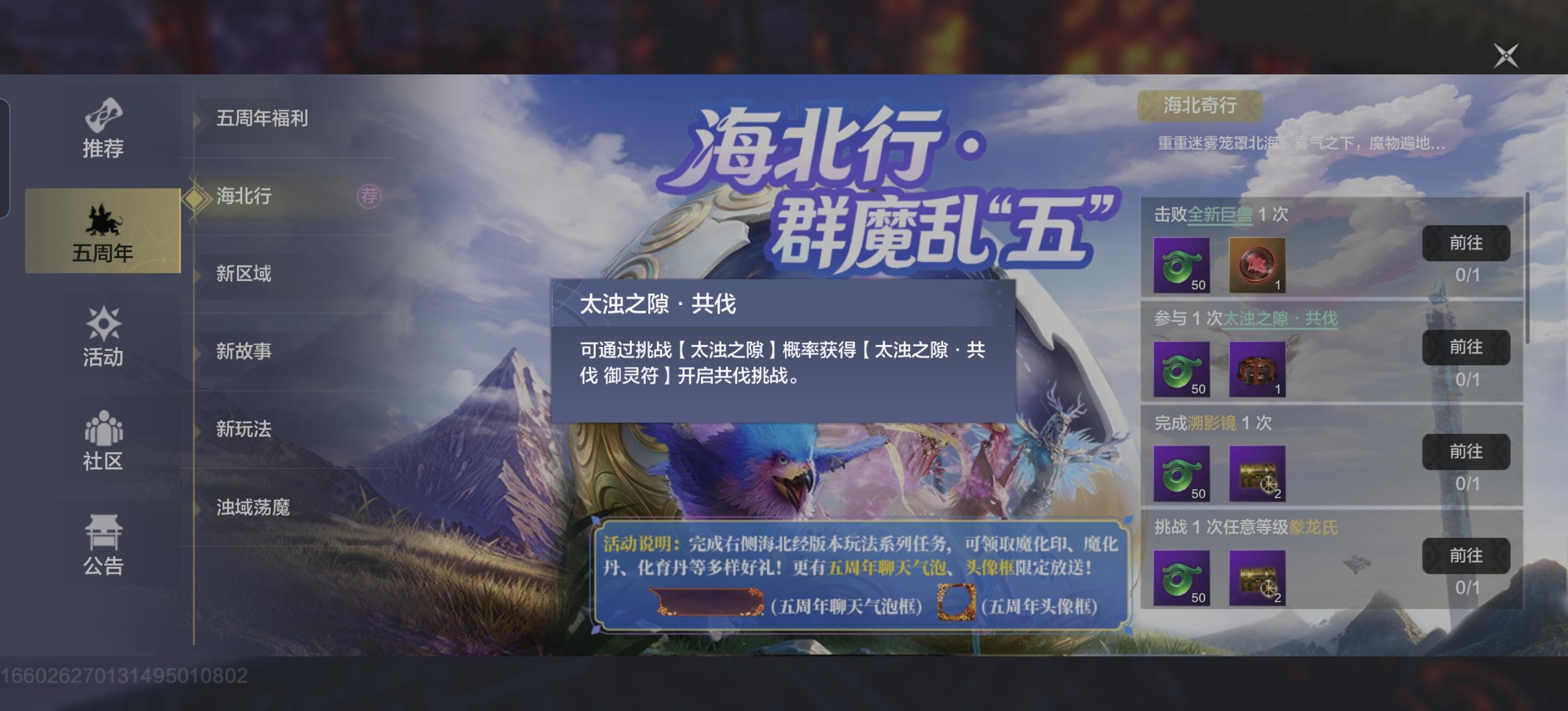 各位旅者好呀!妄想山海五周年版本已全服重磅上线,诚邀旅者们即刻启程,共赴这场跨越五年的山海之约,开启全新冒险!五周年,是山海十年之约的重要里程碑。本次大版本福利与惊喜齐发 —— 不仅有大家期盼已久的北海全新区域、帝江新进化兽、全新异兽、大世界魔化巨兽悉数登场,还有全民可免费领取的八万年 “代言兽”尸鲲,也有全新的魔化玩法!对于这个诚意满满的大版本,相信你一定有不少独到见解。无论你是想表达支持