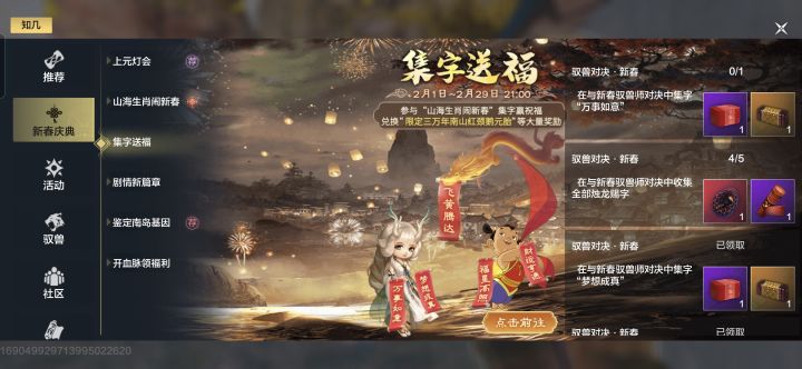 新春的这个集字活动,大家在玩的应该都听说过吧,就是凑齐四字的祝福语就可以拿一种奖励,在三天前,误打误撞凑到了福星高照,于是发现只剩下最后一个“万事如意”就开始搞这个活动,本来想着只差最后一个了,应该没多困难,直到打到晚上三点也没吞出来,在后续的两天继续吞,一有时间就吞,但毫无例外都失败了,我就想说,你搞这个庆典活动是专门膈应人的吗?到底是送还是不送?每次打到白变字的时候发现只叠到一个或者两个字,就