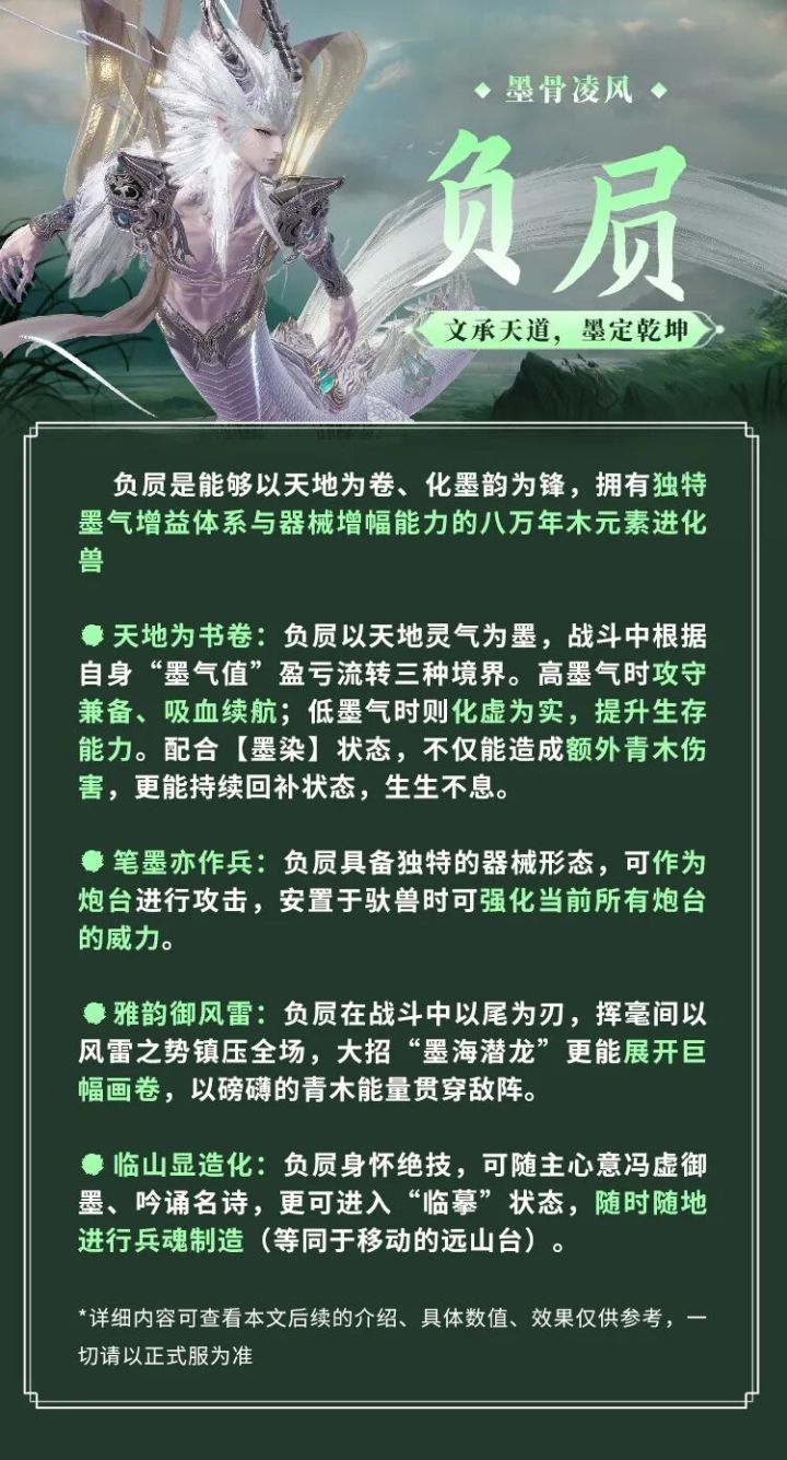 负屃·外观展示负屃·特色机制墨韵三境负屃以天地为书卷进行创作,法力来源主要源自于天地灵气,负屃释放技能将会消耗自身墨气。同时攻击会给目标附上【墨染】状态释放技能时需要消耗【墨气值】,且自身会根据剩余【墨气值】获得不同的加成:高于60%:获得20%伤害加成、45%伤害减免;攻击命中时恢复自身血量20%-60%:自身伤害减免提升至75%;技能期间自身出现虚影时获得一次伤害格挡低于20%: