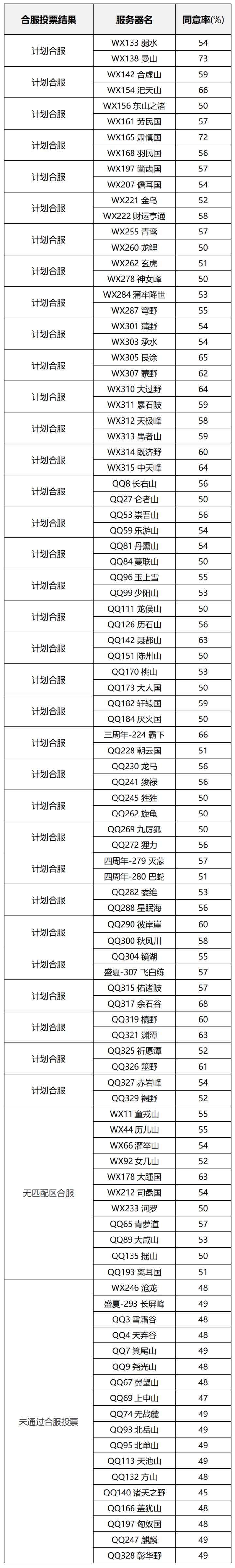 为打造更健康、更稳定的妄想山海游戏环境,持续提升各位旅者的游玩感受,山海管理司基于游戏行为数据分析,在部分服务器发起合服投票。具体规则如下:收到投票通知的服务器中,等级达到 60 级及以上的旅者拥有投票资格;当该服务器内投出同意票的旅者占比超50%时,本次合服投票即判定为通过。近期合服投票通过区服公示如下:以上通过合服投票的区服,预计将于3月17日(微信区)、3月26日(微信区)、4月2日(Q