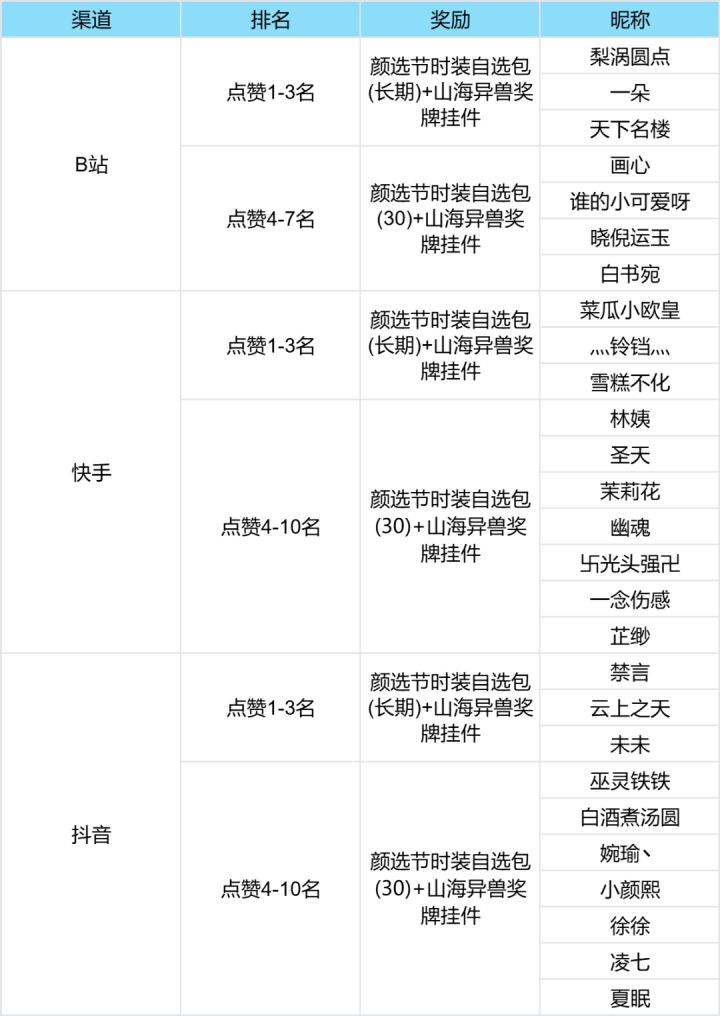 旅者们好呀!为期两周的【颜选节“分会场”拉票赢周边】活动在大家的热情参与下圆满落幕啦!咪姐这次可是大开眼界!不管是颜值超高的旅者晒照,还是可爱呆萌的爱宠照片。感谢每一位秀出自我、为爱发电的旅者!现在,就是大家最期待的揭晓时刻!根据投稿作品的点赞数据排名,【视频分会场-秀出自我】各渠道的获奖旅者名单公布如下:恭喜以上在抖音、B站、快手平台脱颖而出的旅者获得专属的颜选节时装及“山海异兽奖牌”周边