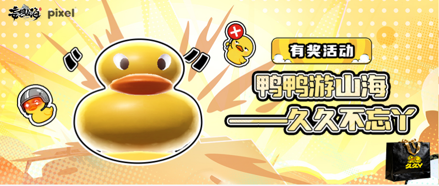 久久丫小黄鸭空降大荒,等你来一起分享“鸭”。《妄想山海》× 久久丫联动已火热开启!联动限定外显——小黄鸭发型“鸭制全场”、小黄鸭头饰“顶住鸭”,以及联动限定称号——“嘎嘎乱杀”、“DUCK不必”均已同步降临~其中哪一个如同麻辣鲜香的久久丫一样是你最中意的?一起来晒晒“鸭”~图片来自山海UP主的分享参与方式视频投稿方式:前往B站、快手、抖音平台发布视频,视频标签选择#妄想山海 #鸭鸭游山海,