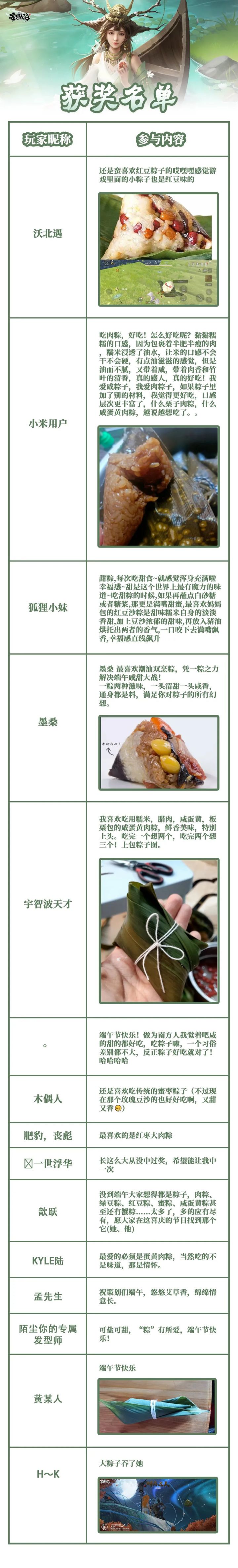 万水千山“粽”是情,咪姐也是看到了大家的热情,一年一度的端午,粽子是必不可少的节日代表,不管是什么馅的粽子,不管是甜粽子还是咸粽子,都是旅者们喜爱的美食,而再我们大荒世界中寻找粽子晒合照也是旅者们喜闻乐见的事情。已经有旅者迫不及待想要晒他们的合影了!没错,咪姐今天就是来宣布开奖结果哒!而揭晓之前,咪姐还要告诉大家一个好消息!因为大家太热情啦,咪姐被大家的气氛所感染,所以额外追加了5个中奖名额,所