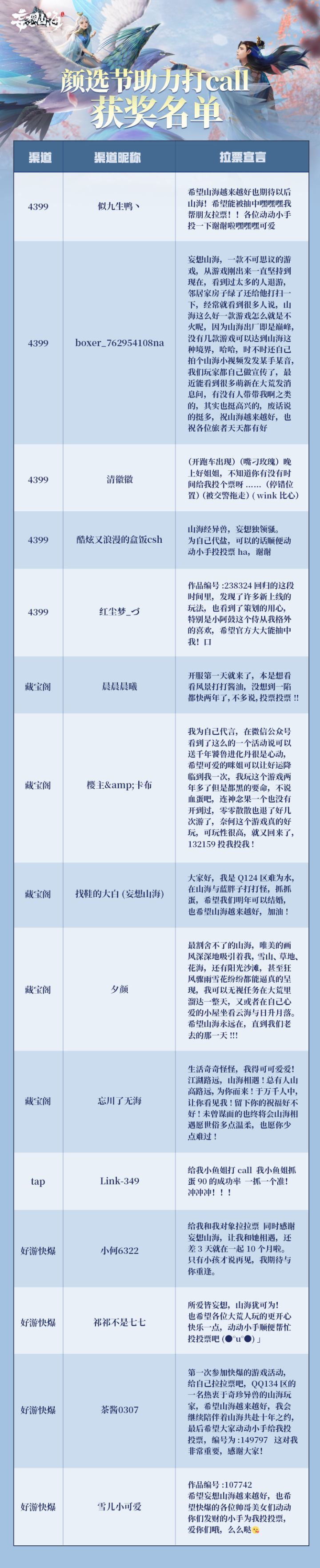 晚上好呀各位旅者!激动人心的颜选节活动已经落幕。活动期间,我们不仅见到了许多山海世界隐藏的帅哥美女,更是收获了不少旅者为自己或者自己喜爱的旅者助力打call的宣言,这些宣言或真挚,或俏皮,或别出心裁~非常感谢各位旅者对山海的支持!下面快跟随咪姐一起来看看都是哪些旅者获得了我们的奖品吧!祝贺以上获奖旅者,每位旅者可获得:【千年窫窳进化丹】*1~本次获奖的旅者请在7天内(12月25日前)通过扫描下