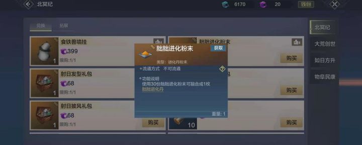 《妄想山海》中“朏朏进化丹”可以通过纪元商店购买,不过商店中可以兑换的是“朏朏进化粉末”,粉末需要三十份才可以合成一个完整的进化丹。游戏中一份进化粉末需要10个“北冥玉·上古”,而一个“北冥玉·上古”需要20个“北冥玉”,也就是说一份完整“朏朏进化丹”需要花费6000个“北冥玉”。游戏中“北冥玉”可以通过在纪元活动中完成各种各样的任务获得,其中纪元任务包含全服任务、剧情任务、个人任务等,其中全服