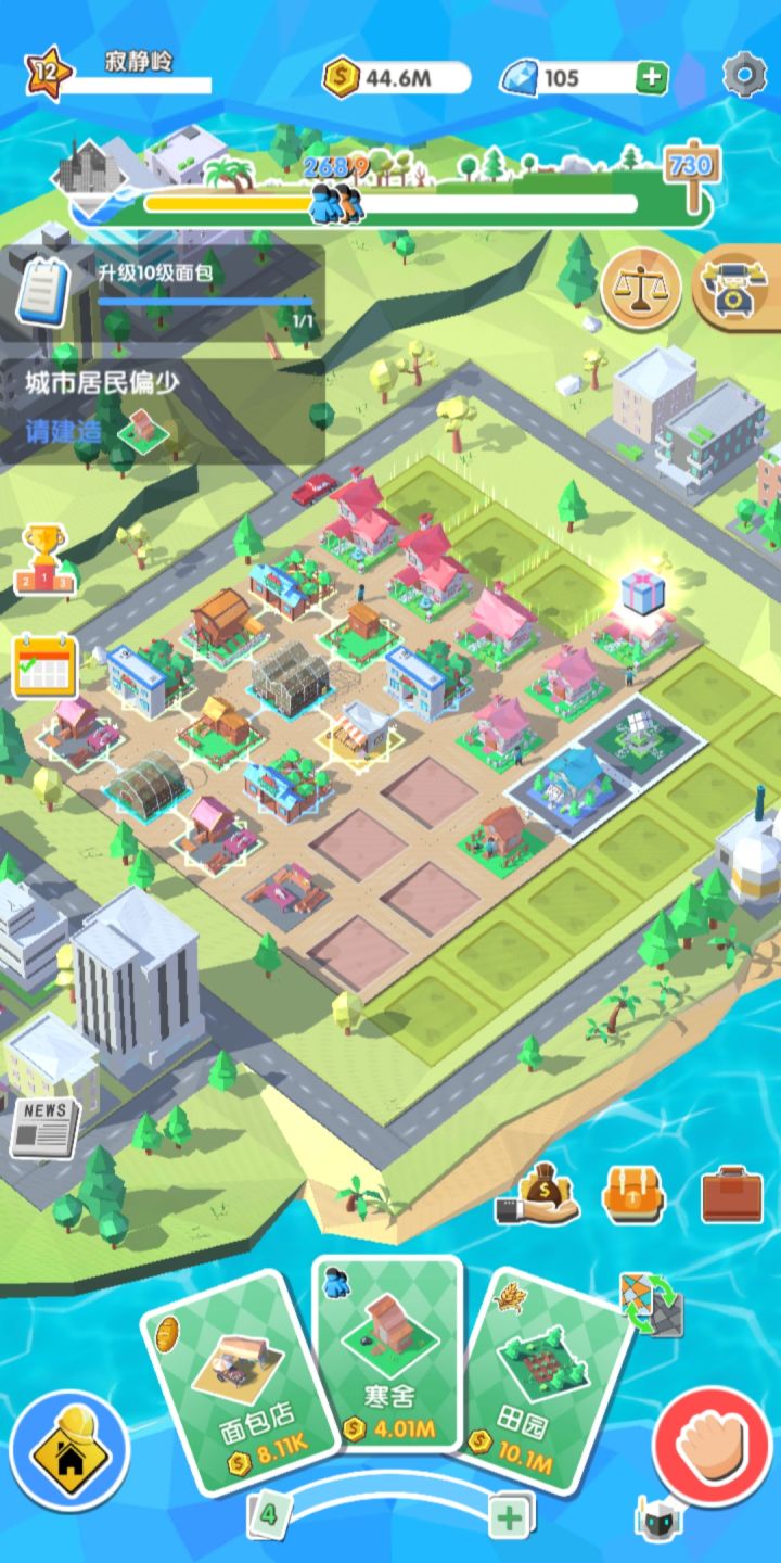 作为一开始就进入游戏的玩家,前期被坑的地方太多了,这里先做一些总结。第一,这游戏人口比生产建筑要重要,要尽可能保持总人口略大于工作人口。第二,虽然教程里面没有提及,但是此游戏不只是三合一,三合一,三合一!前期生产建筑三合一需要的工作人口会变多,而房子三合一总人口不会变多,所以在前期尽可能的用四个或五个房子(直线或T型等)去合成更高级的房子。 第三,前期的话,尽量压低等级。高等级会带来新的建