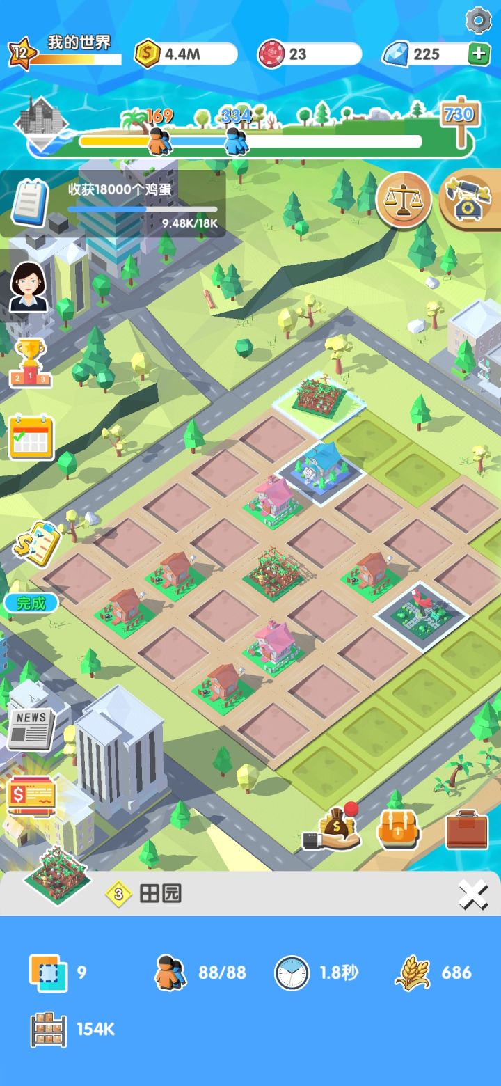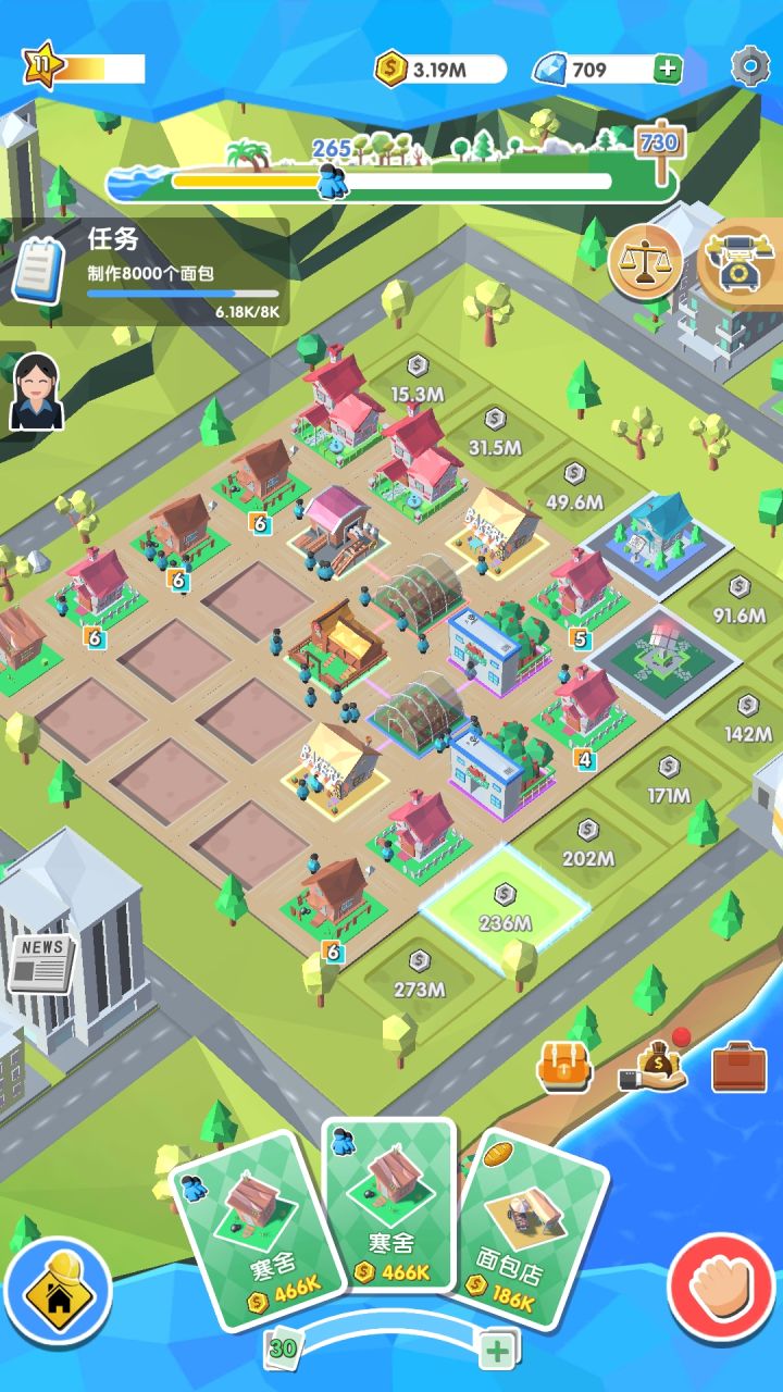 前期尽量多合一。且房子等级不要超过3,因为后面还得重新极致9合1。好处就是占地少,后面玩的舒服。(后面就是刷牌建筑)。ps:每次建筑只能建同样的。房子3级可以81人,4级可以729人。只占一格子。ps2:右下角的红色手掌别点,会获得经验的。一升级建筑会变高价钱。