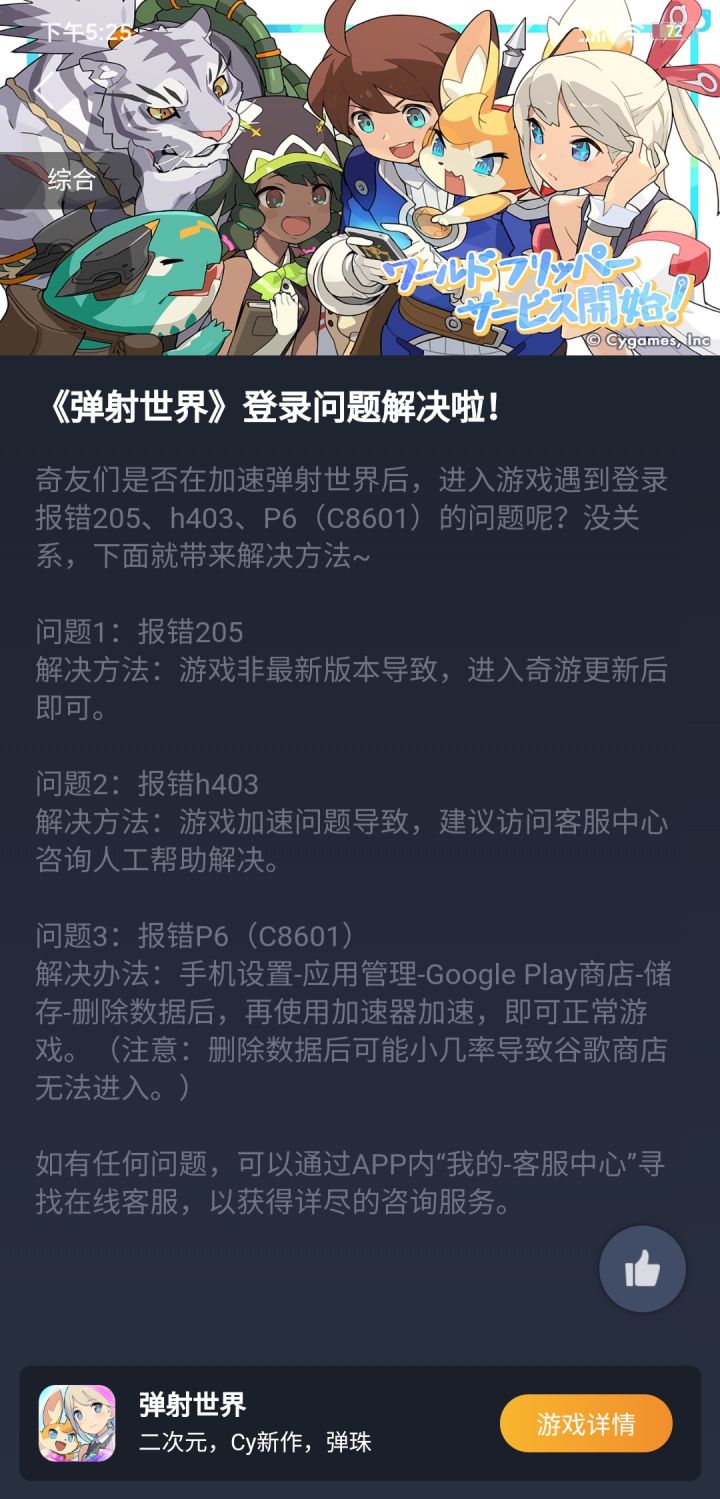 问题1:报错205解决方法:游戏非最新版本导致,进入奇游更新后即可。问题2:报错h403解决方法:游戏加速问题导致,建议访问客服中心咨询人工帮助解决。问题3:报错P6(C8601)解决办法:手机设置-应用管理-Google Play商店-储存-删除数据后,再使用加速器加速,即可正常游戏。(注意:删除数据后可能小几率导致谷歌商店无法进入。)以上内容转载于奇游,如图所示