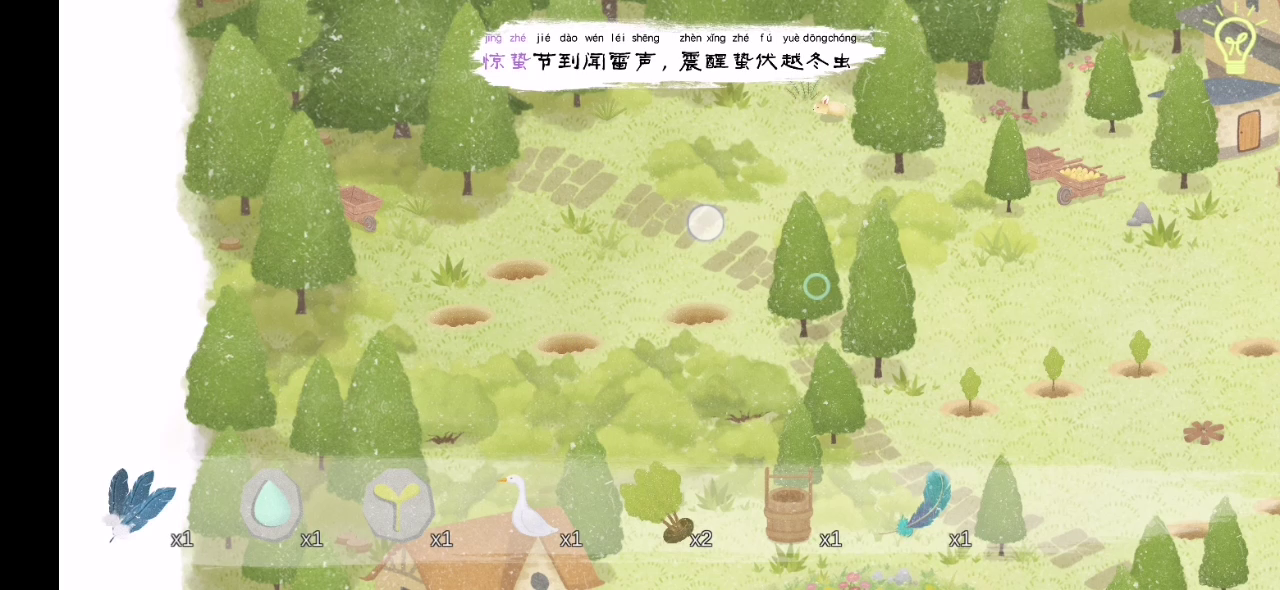 我先说几个bug吧,提前给水桶和犁他还会问着要;提示词有错字,像惊蛰那里的“房子”写成“方子”。地图挺大,但是东西都太小了,还不能缩放,时不时拉远景,对眼神不好的人不太友好,找东西找好久都没找见。还有有时根本不懂提示是什么,灵敏度也不够,点鱼点半天没捡起来,点燃火堆棍子递了半天都不能生火。唯一可取的是国风元素和小清新的画面吧。继续加油。
