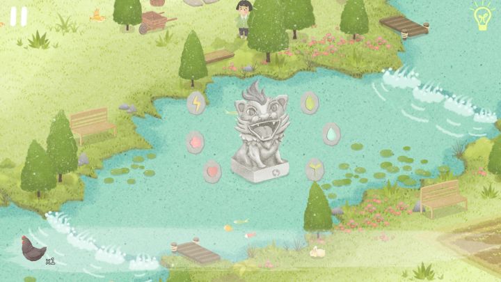 这部游戏画风清新可爱,游戏玩法是根据人物提示找物解密,因为东西太小我找不到所以一直在等提示౧(*മ് ധമ്)੭ु⁾⁾。第一章《春》,地图便渲染了一副生机勃勃的样貌,在解密后地图也会发生些改变,如:有了河水(也就有了鱼),茶叶长大,河中有了河神和一个石像……游戏操作并不难,甚至可以说十分轻松,一个提示只要等个十几秒或几分钟(最多2,3分钟),没有广告和bug。可以让玩家在解密途中领略春天的美丽与农