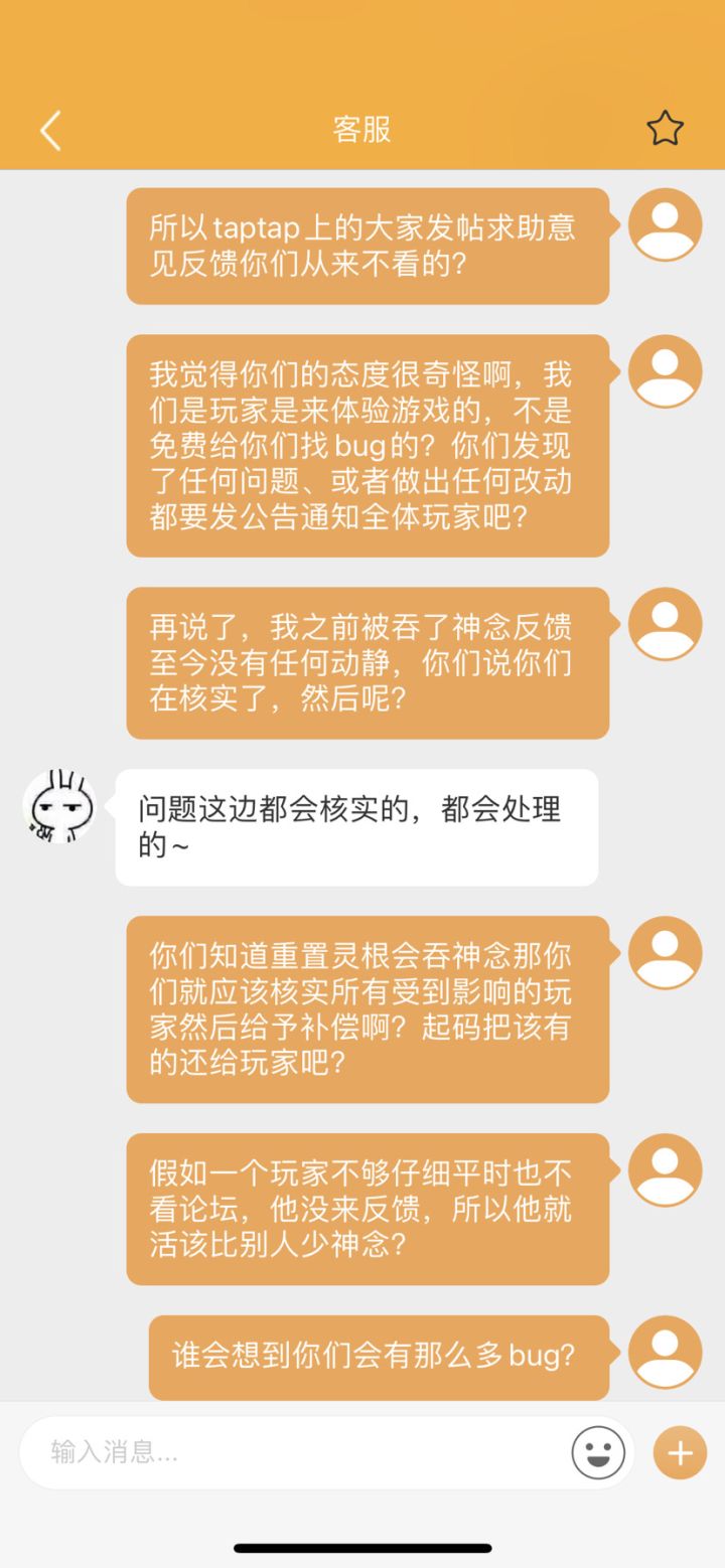 是我太较真还是官方太敷衍?我认为一个游戏应该为自己的bug负责,不求补偿但最起码你吞了玩家什么就要原封不动地还给玩家什么,哪怕只丢了一灵石那也是玩家的资源,系统出错导致玩家资源丢失就应该由官方核实后并主动还给玩家,难道不应该是这样吗?但客服给我的回复好像完全不是这么回事?
